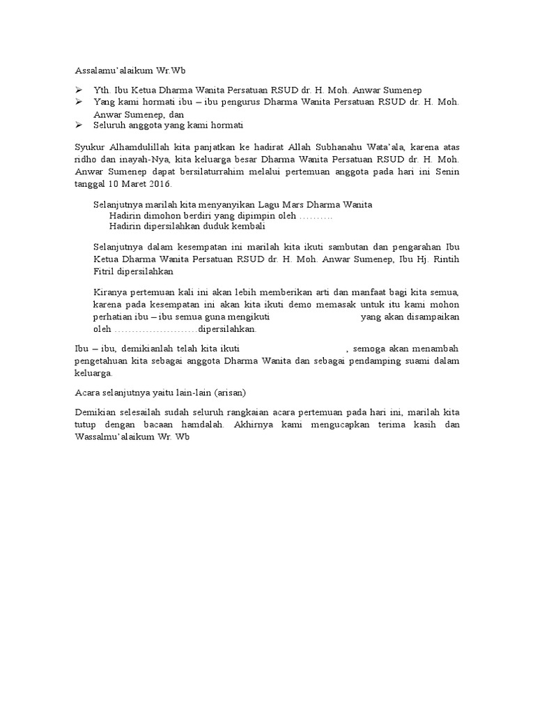 You can Find and Download the Susunan acara dharma wanita. Semoga dengan postingan diatas yang berjudul Contoh Susunan Acara MC Pertemuan Rutin Ibu Ibu PKK dapat bermanfaat untuk sobatku semuanya yang sedang mencari beberapa. Teks Doa Pembukaan Acara Resmi Teks Doa Arisan Darma Wanita Terbaik -.