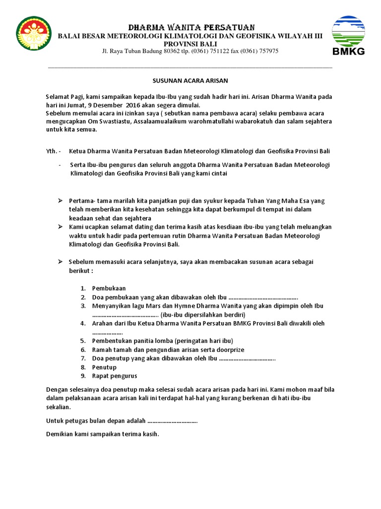 Sedangkan untuk contoh susunan acara arisan Dharma wanita dari BMKG Bali sebagaimana dibawah ini. Acara Arisan Dharma Wanita Persatuan. Ø Sambutan Pertama disampaikan Ketua Panitia Penyelenggara kepada yth.